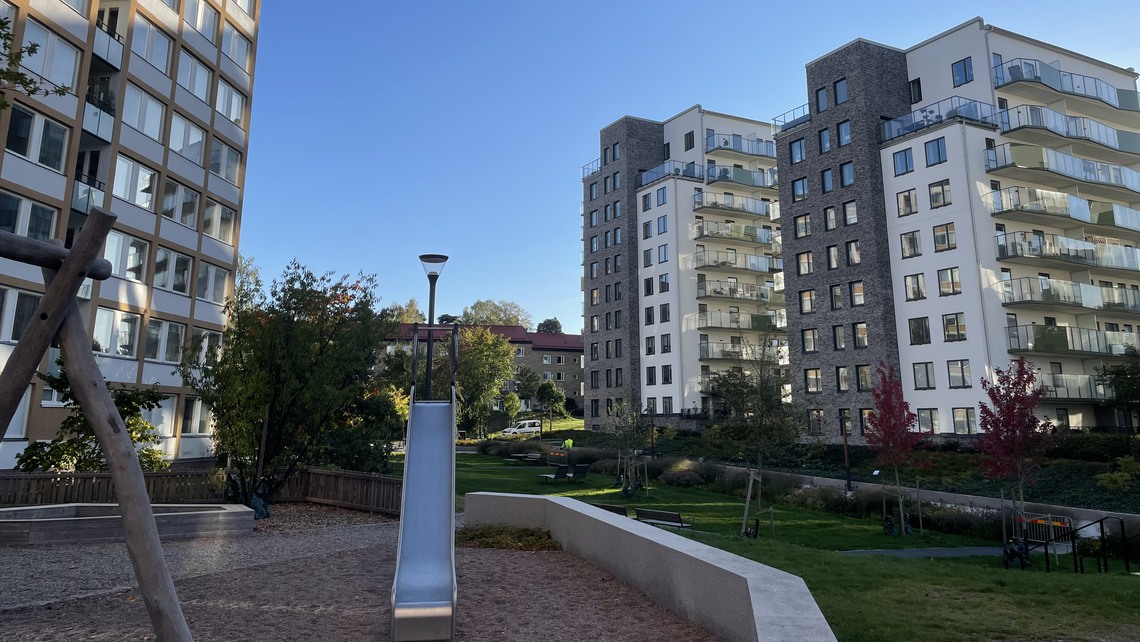 - Från torget når du parken mellan husen i Mörby. Detta är en grön oas med parkbänkar och picknickbord, utegym och lekplats, blomsterängar och planteringar.