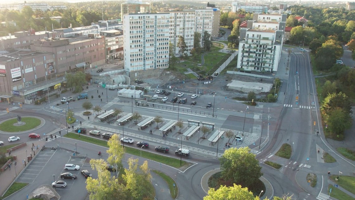Ta en flygtur! Så här som på filmen såg det ut när vi anlade den nya parken och det södra torget 2023. Mycket har hänt sedan dess och framöver utvecklar vi norra sidan av Mörby centrum.