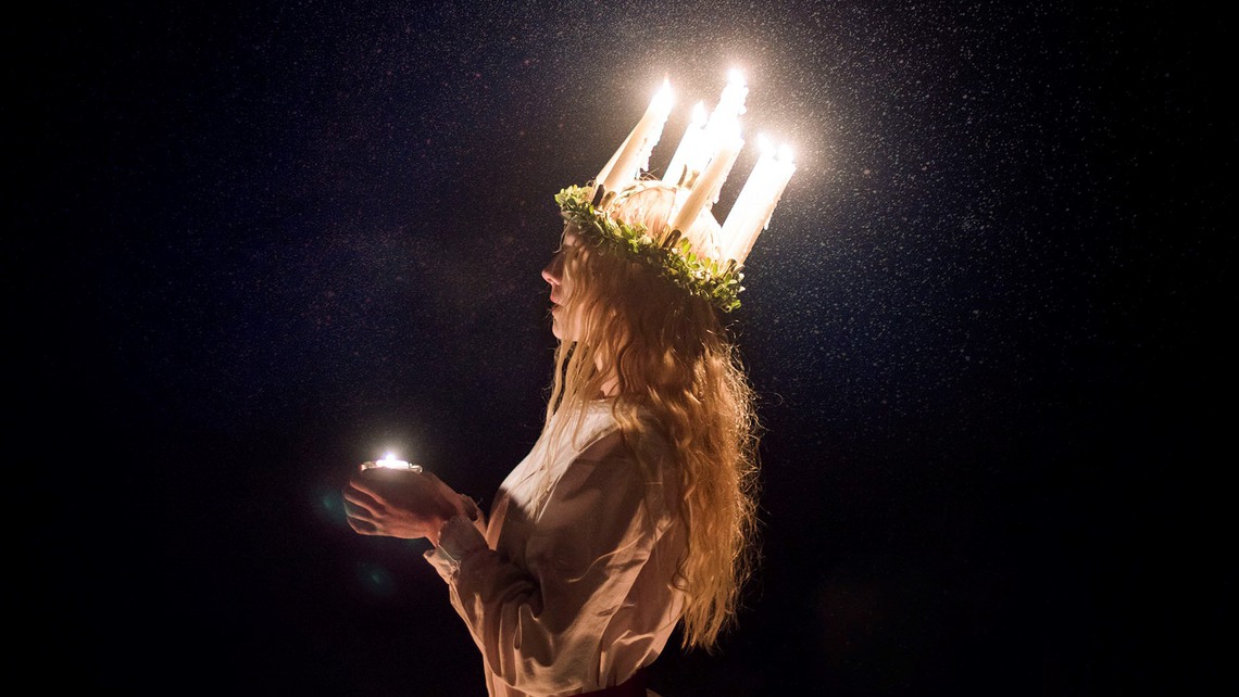Så mörk är natten i midvintertid, men se då nalkas Lucia. Hon kommer den goda med ljuset hit, hon kommer med hälsning om julefrid, hon kommer med ljus i sin krona.