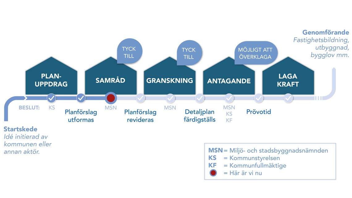 Under 2017 var förslaget på samråd vilket väckte stort engagemang bland boende i området och uppdraget avbröts 2018. En omfattande medborgardialog genomfördes 2021 vilken ligger till grund för planarbetet.