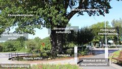 Bilden föreställer Sätraängseken och illustrerar alla de ekosystemtjänster som ett stort träd bidrar med.