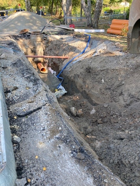 Vi anlägger en ny ledning för spillvatten och dricksvatten (ca 70 m) utmed Kaptensbacken och i korsningen Kaptensbacken ‐ Stockbyvägen.
