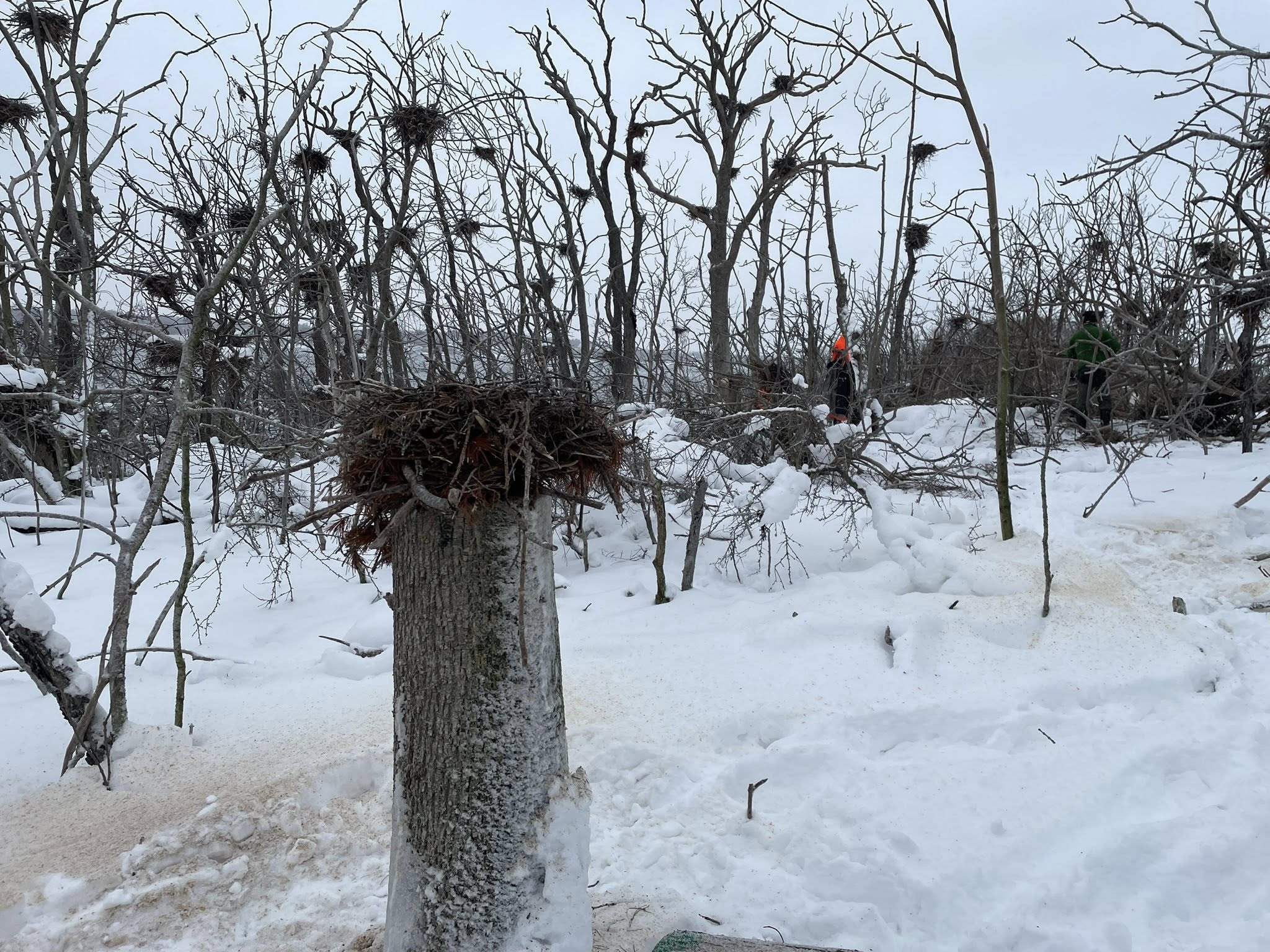 Årets kontroll av skarvar på Västerskär inkluderar kapning av träd och trädkronor för att få skarvarna att häcka längre ner så att äggen kan nås för oljéring.