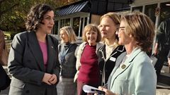 Simona Mohamsson samtalar med skolchef Petra Hellström och Mörbyskolans rektor Isabel Rodriguez. I bakgrunden syns bl.a. Annika Linde, 1:e vice ordförande i utbildningsnämnden.