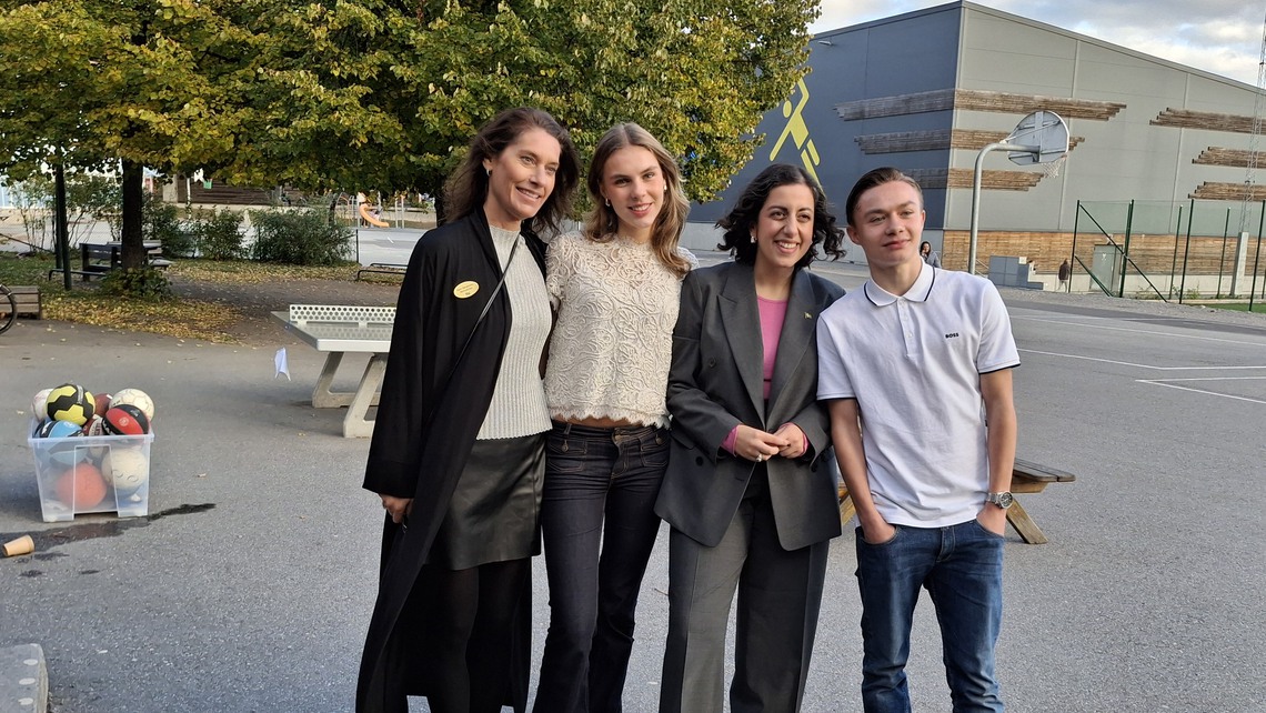 Malin Bengtström, som är ansvarig för Mörbyskolans rastverksamhet, elevrepresentanterna Sonja och Milo samt utbildningsminister Simona Mohamsson på Mörbyskolans skolgård.