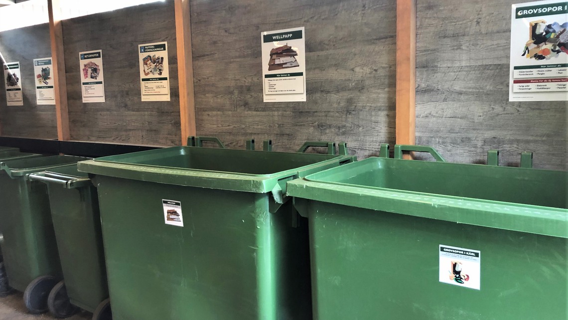 - Källsortering av matavfall, förpackningar, wellpapp, returpapper, grovavfall, elavfall och restavfallet.