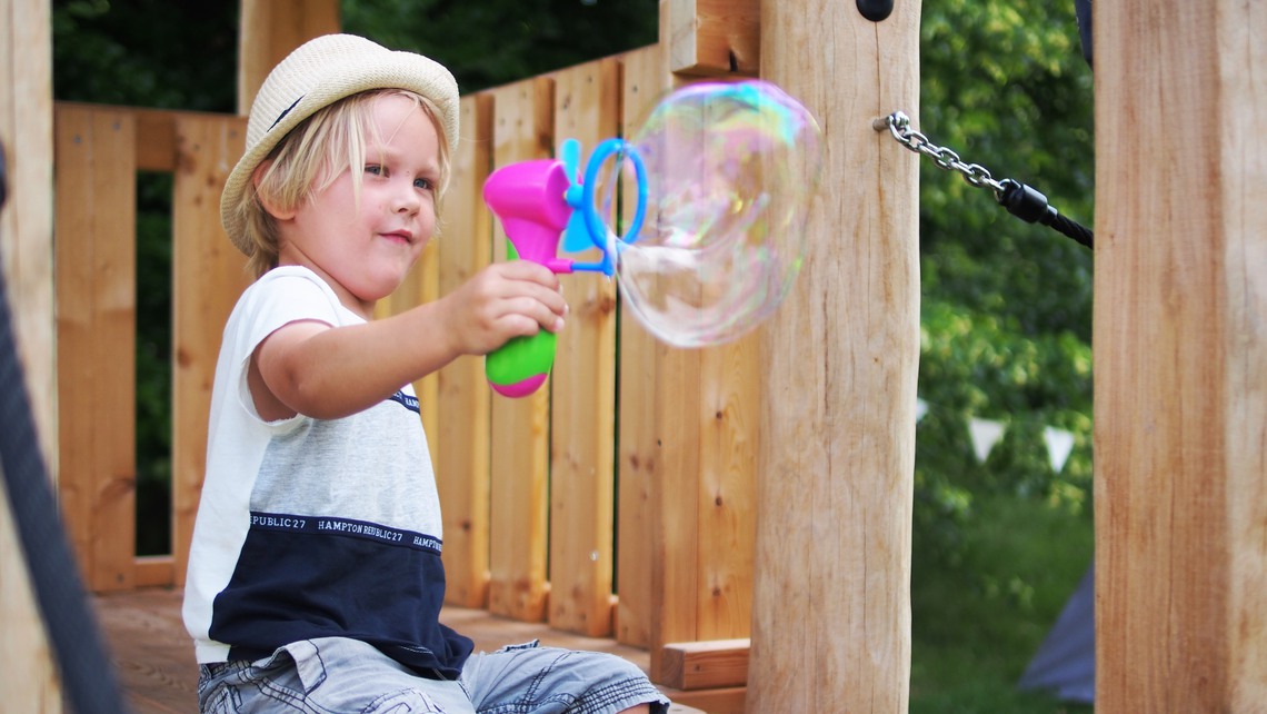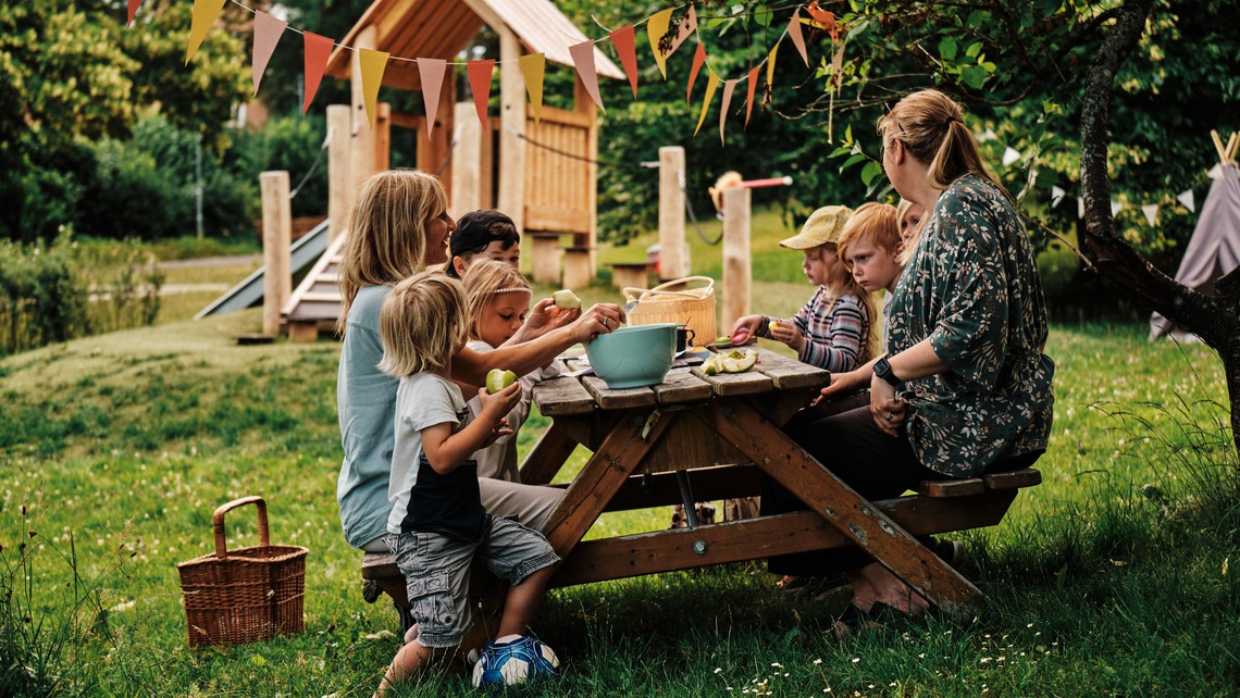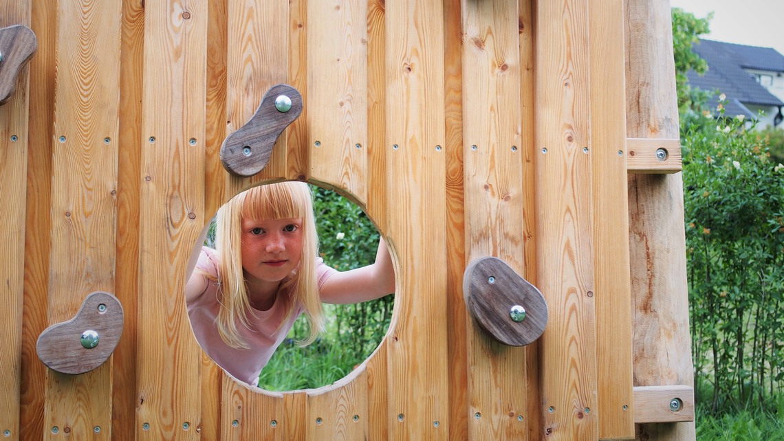 Här finns också ett aktivitetsområde för äldre barn med en mer avancerad klätterställning. Framförallt finns det stora gräsytor för lek.